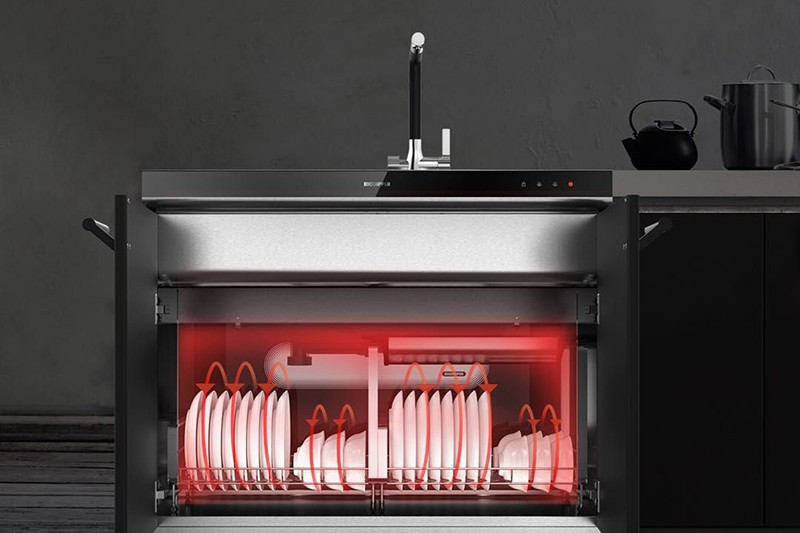 下層“干”區域為烘干+儲物功能,為餐具提供一個潔凈干爽的儲存環境,并有效預防細菌滋生,適于長久儲存碗碟。
